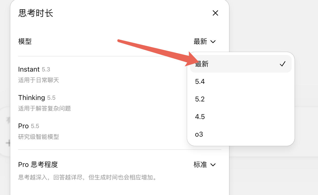 选择最新即是 5.5, 同时也能切换到 5.4 等模型
